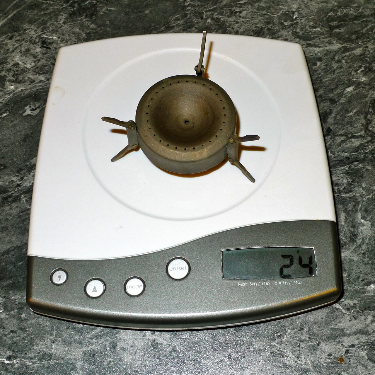 Whitebox Solo: all aluminium construction, it consists of a simple cylinder with a smaller tapered insert into which you pour the fuel. The base of the insert has two little holes that allow fuel into a gap between the inner and outer parts. Around the outer part of the stove are 15 jets that face outwards. The stove is 58mm diameter and weighs 34 grams.