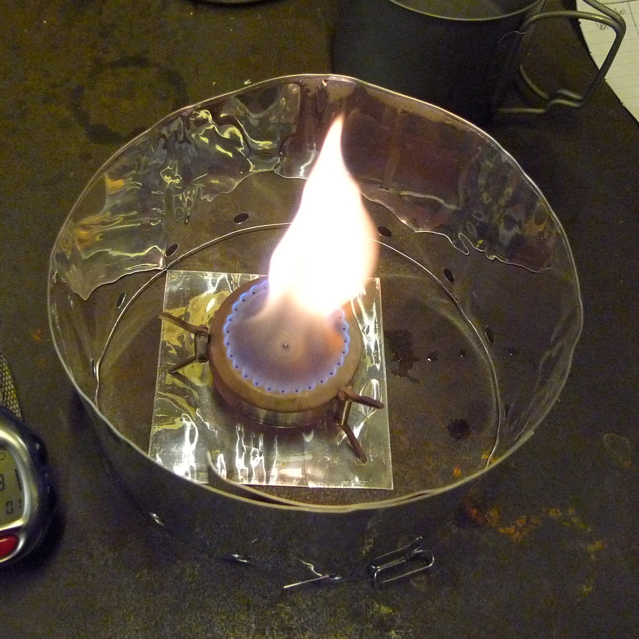 The test environment was my garage work bench and all four boil tests were run consecutively. I used the supplied Whitebox reflective wind shield for both stoves. The procedure was to fill the stove from empty to full and measure the weight of fuel. I wanted to see which stove worked bet with which diameter pan.