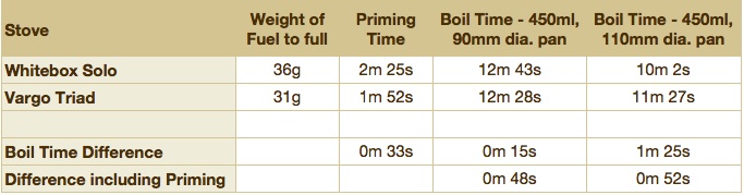 The Whitebox would hold 5 grams more fuel than the Triad, but the priming time of the Triad was 33 seconds quicker than the Whitebox. In the boil test, the results showed that the Triad was 15 seconds quicker to boil the water on the 90mm diameter pan than the Whitebox (45 seconds if the priming time is included). Conversely, the Whitebox was 1 minute 25 seconds quicker than the Vargo Triad with the 110mm diameter pan, but this time is reduced to only 52 seconds quicker when the longer priming time of the Whitebox is taken into account.