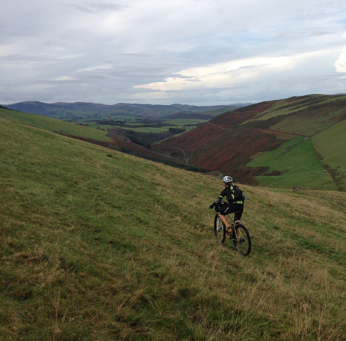 I lead out of Esgair Geulan with Steve Large closely behind. On the run in to Machylleth, the lead group formed comprising of me, Steve, Alan Goldsmith, Phil Richmond, Tom Webb, Chris Purt and Alan Parkinson. Once out of Mach, the route reared up sharply on a tarmac lane. It was not singlespeed territory so I dismounted and watched the others ride off into the distance.