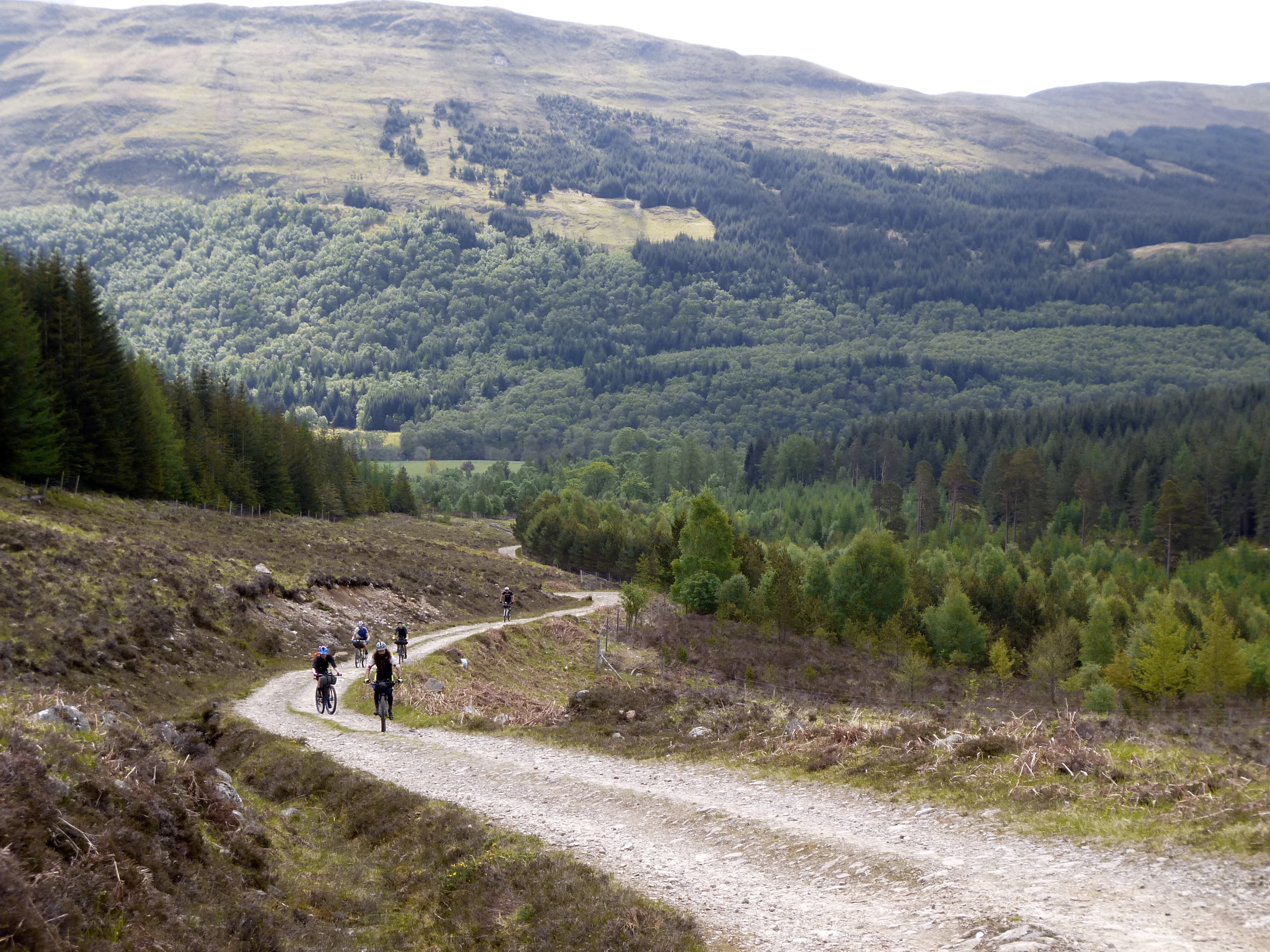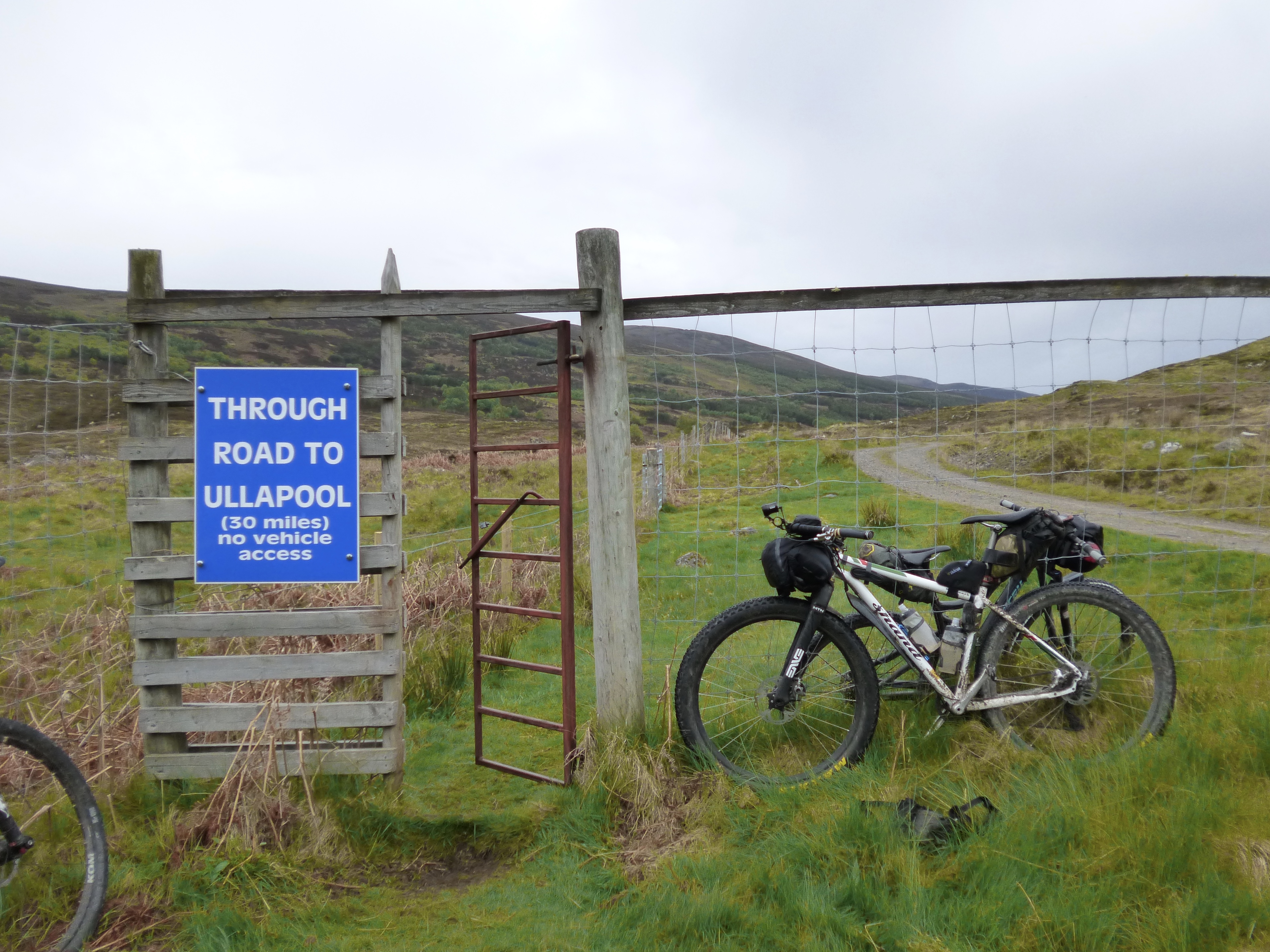 I see. It’s like that then. I decided I should man-up and just get out there. The rain was really hard and unrelenting. I passed Inchbae Lodge, and saw a bike outside. Kenny’s, I think. Turning off the road again, streams poured down the edges of the stone track up through Strath Rannoch. Up ahead, in the gloom, I could see Steve & Co, and this gave me something to aim for. I caught them at the top of the climb out of Strath Rannoch and we descended into Strath Vaich together. Before we reach Croik, the rain had all but stopped, but I kept my waterproofs on to help dry them out. The gate at Croik marks the start of the “mountain road” to Ullapool. But first, we need to do the northern loop…