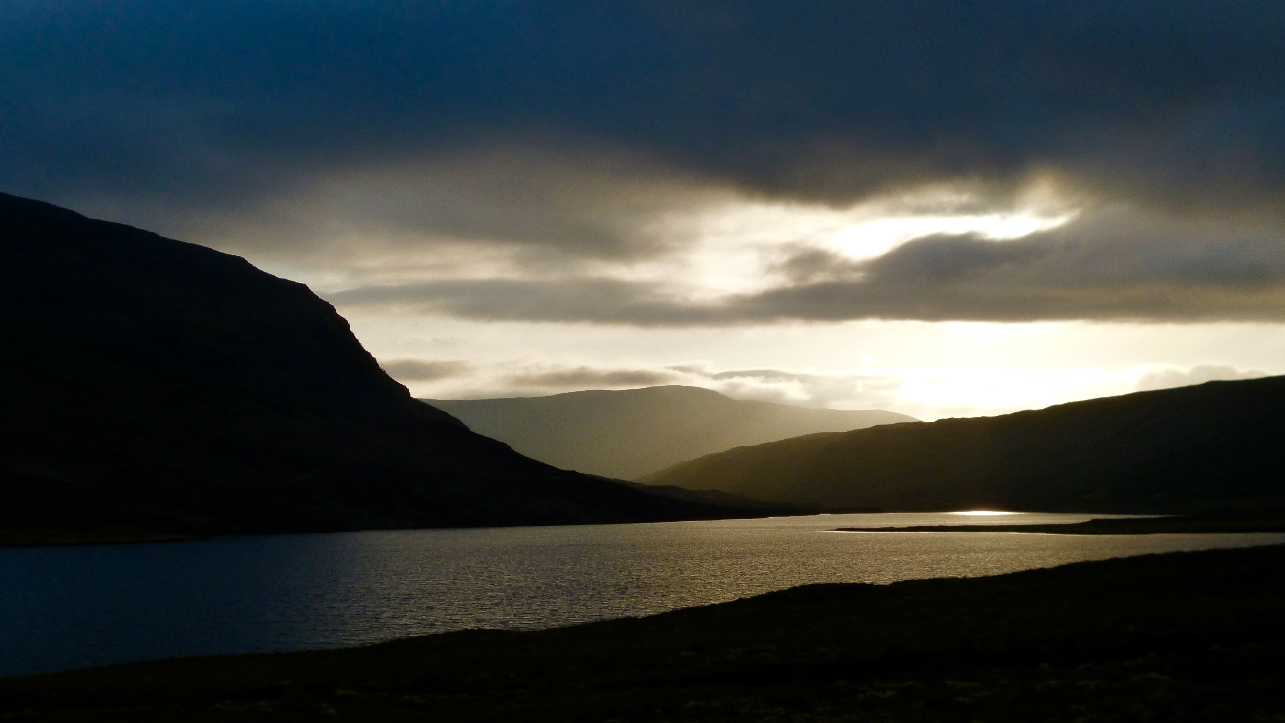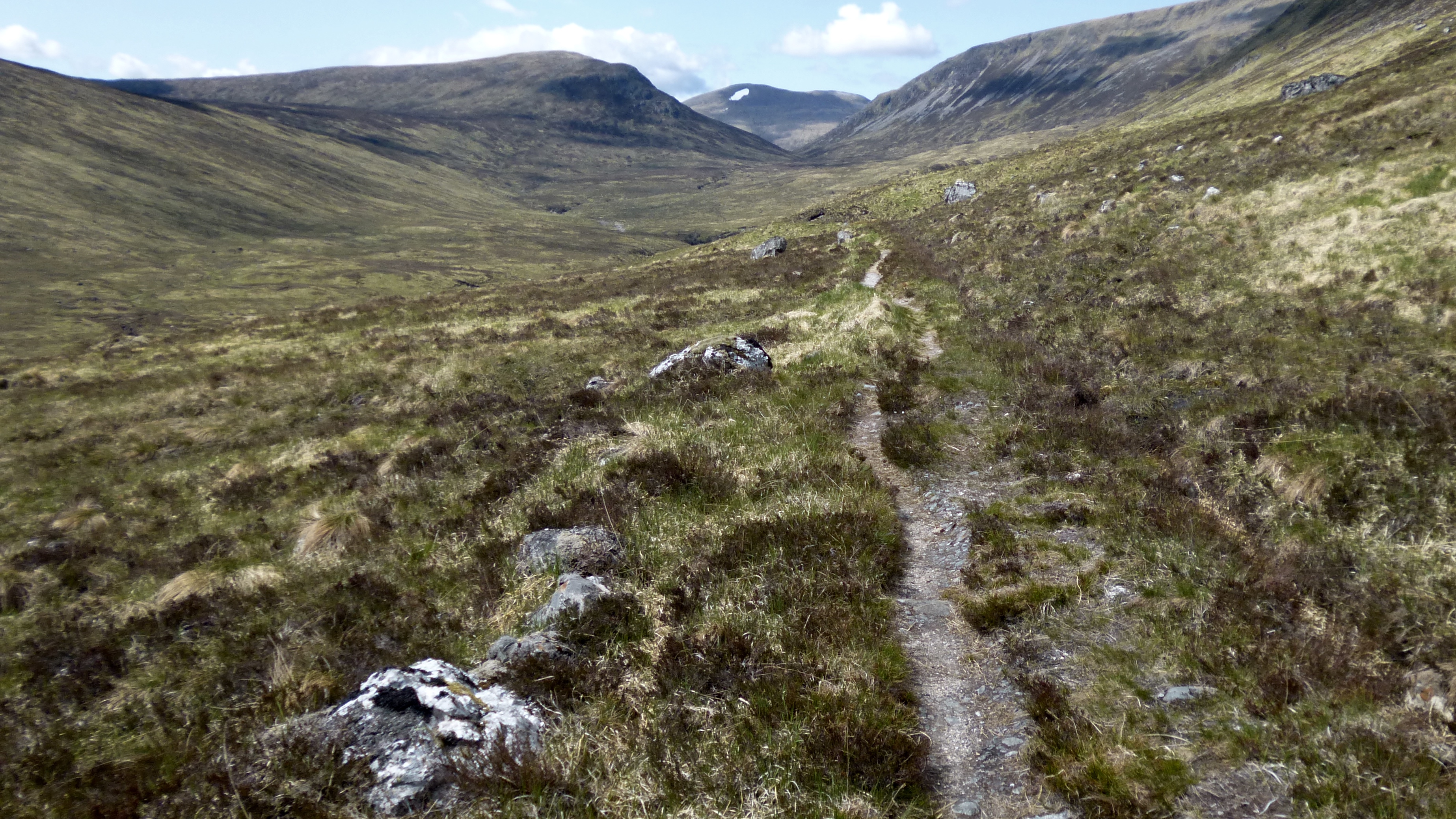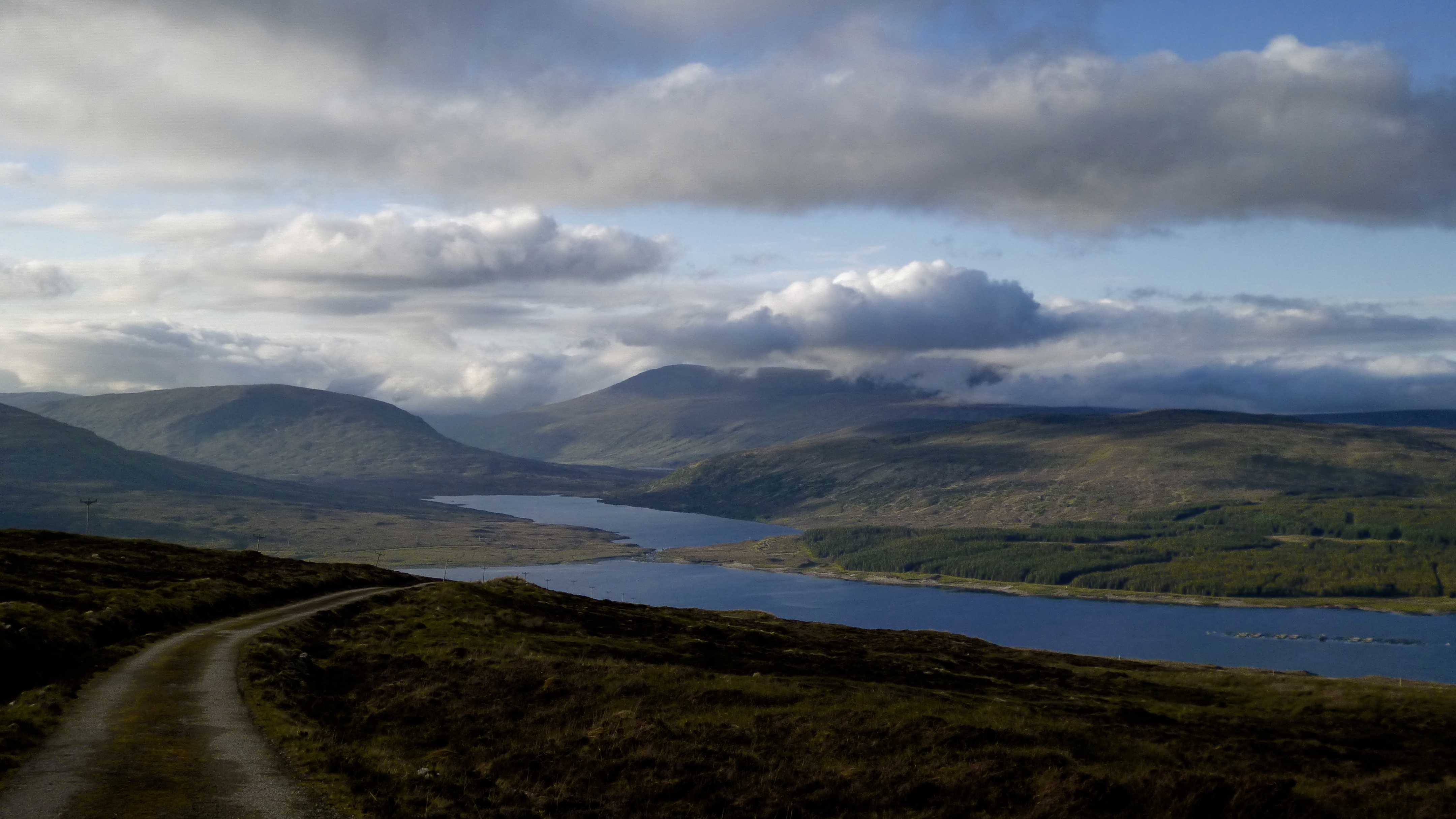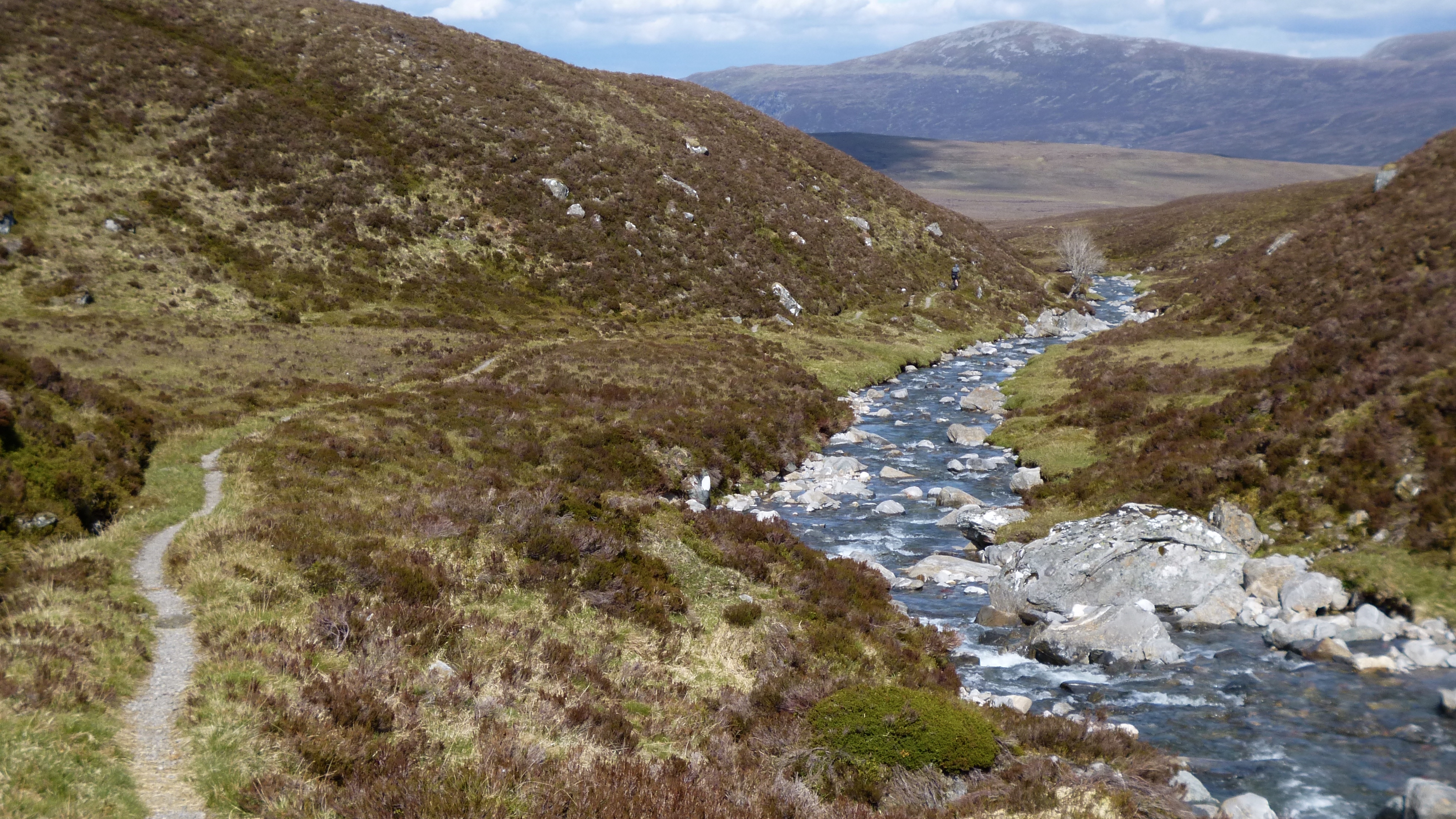 A fast descent in rapidly cooling air brought me to the bottom of the glen. I could see the thick cloud hanging over the Bealach Horn. Did I fancy going over that in the dark? The sinuous singletrack around the lochans, the peat hags, the climb out from An Dubh Loch? It didn’t fill me with excitement, but it was too early to tell; I need to get into Glen Golly first.