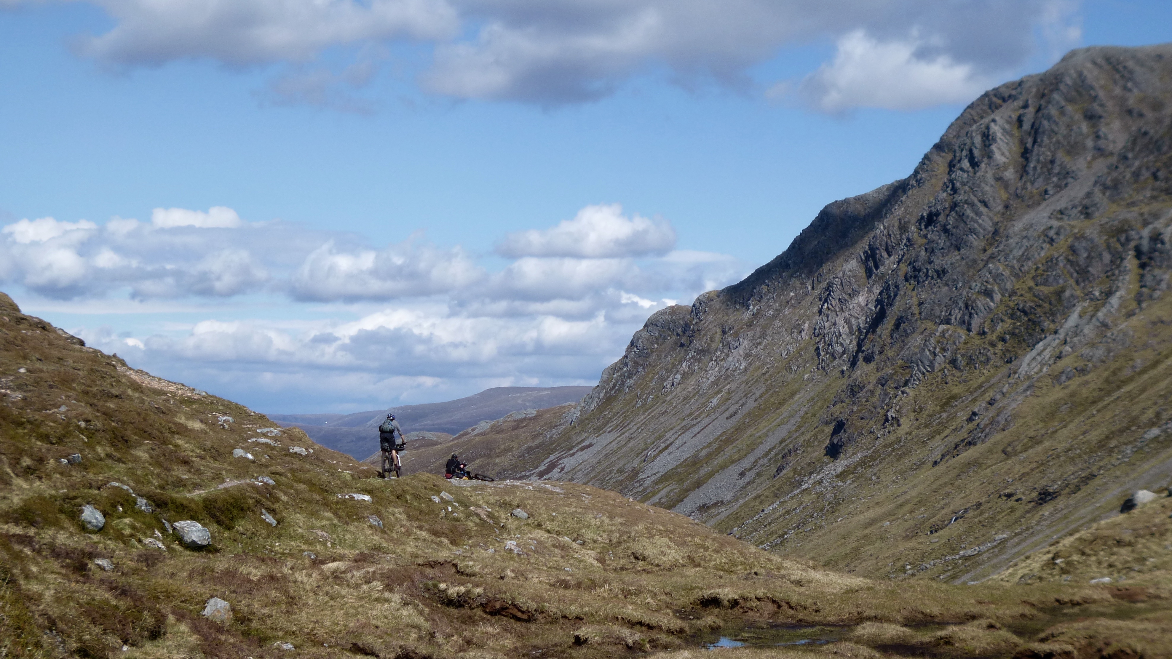 The end of my first significant section on my schedule was Ben Alder Cottage, at 80 km. A decent ride in itself, but in real terms less than 5% of the route, and only halfway to the pizza house in Fort Augustus. The ride here had been good fun, and a nice opener to the route; the sense of wilderness and detachment from civilisation seemed to come much sooner than via the old start on the WHW. The trail that followed Ben Alder cottage was a beautiful narrow ribbon of rising singletrack. Out here in the full sun, I struggled to find my rhythm, still very much feeling I hadn’t shaken off my illness from earlier in the month. A top of sorts came, followed by a short descent and then another climb to the real top. A stunning view opened up in front of me, and the trail plunged down into the head of the next valley. Gian came past me again, riding with a fluidity that I longed to master, hopping each of the water bars like a gazelle.