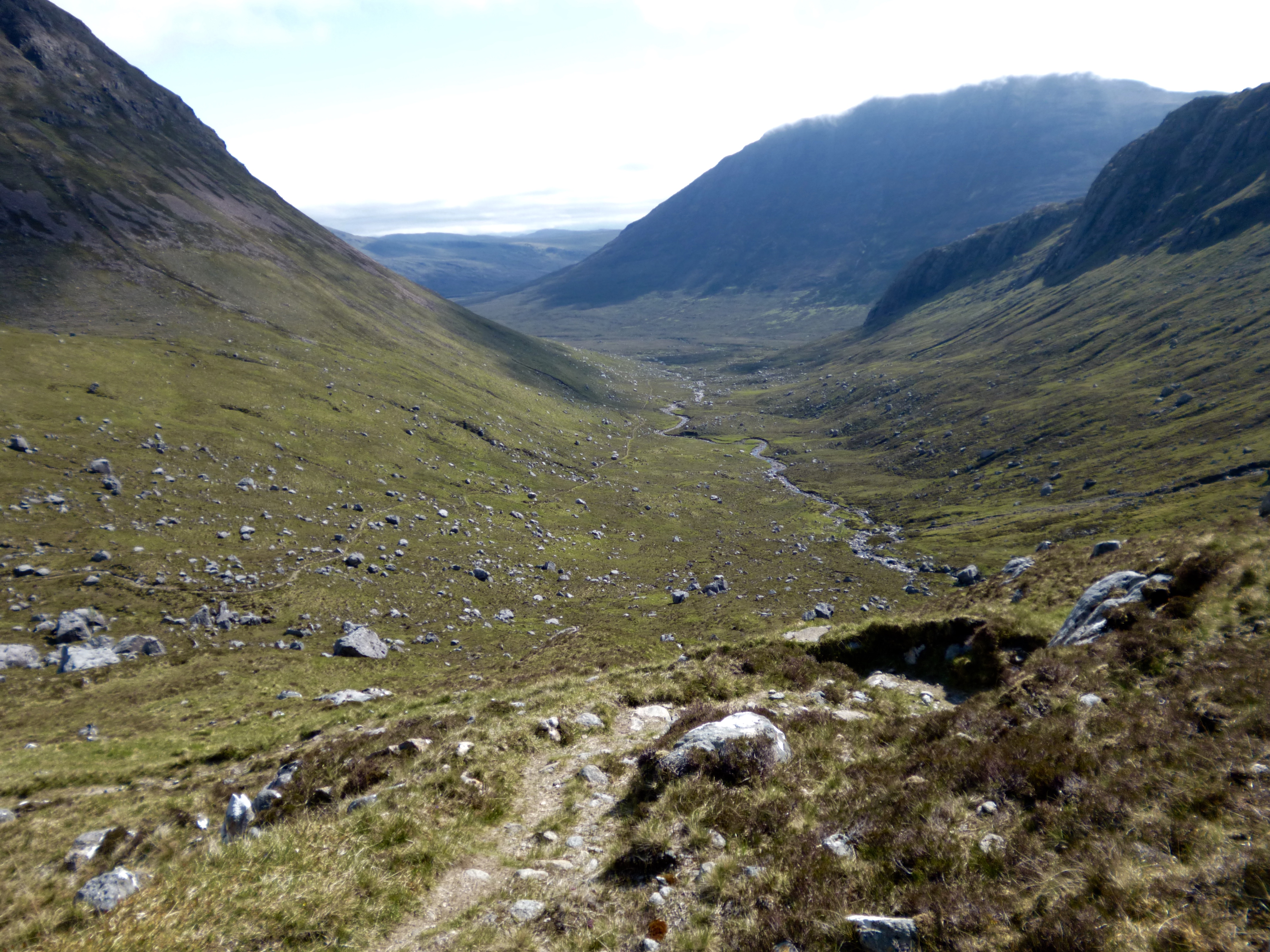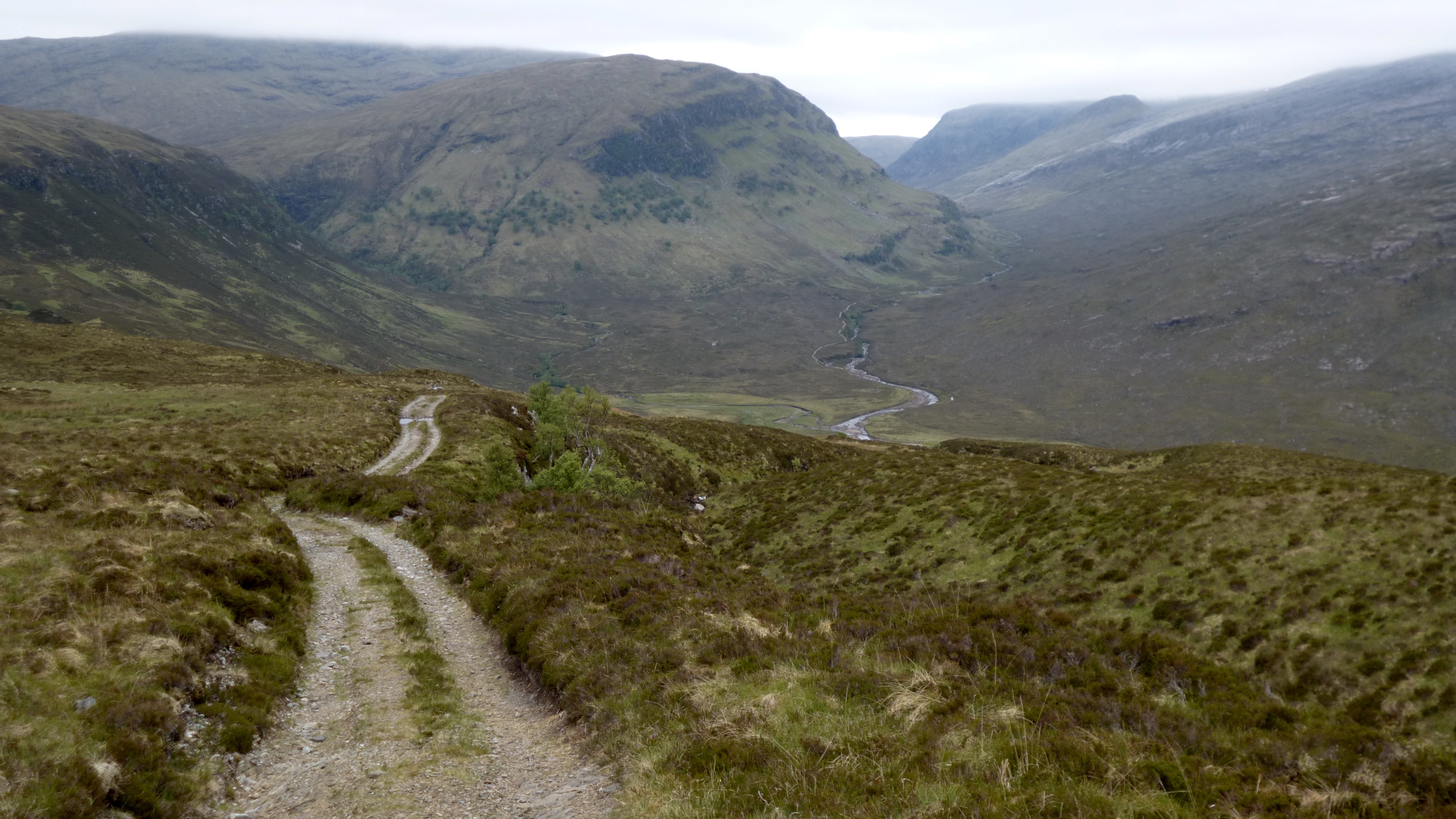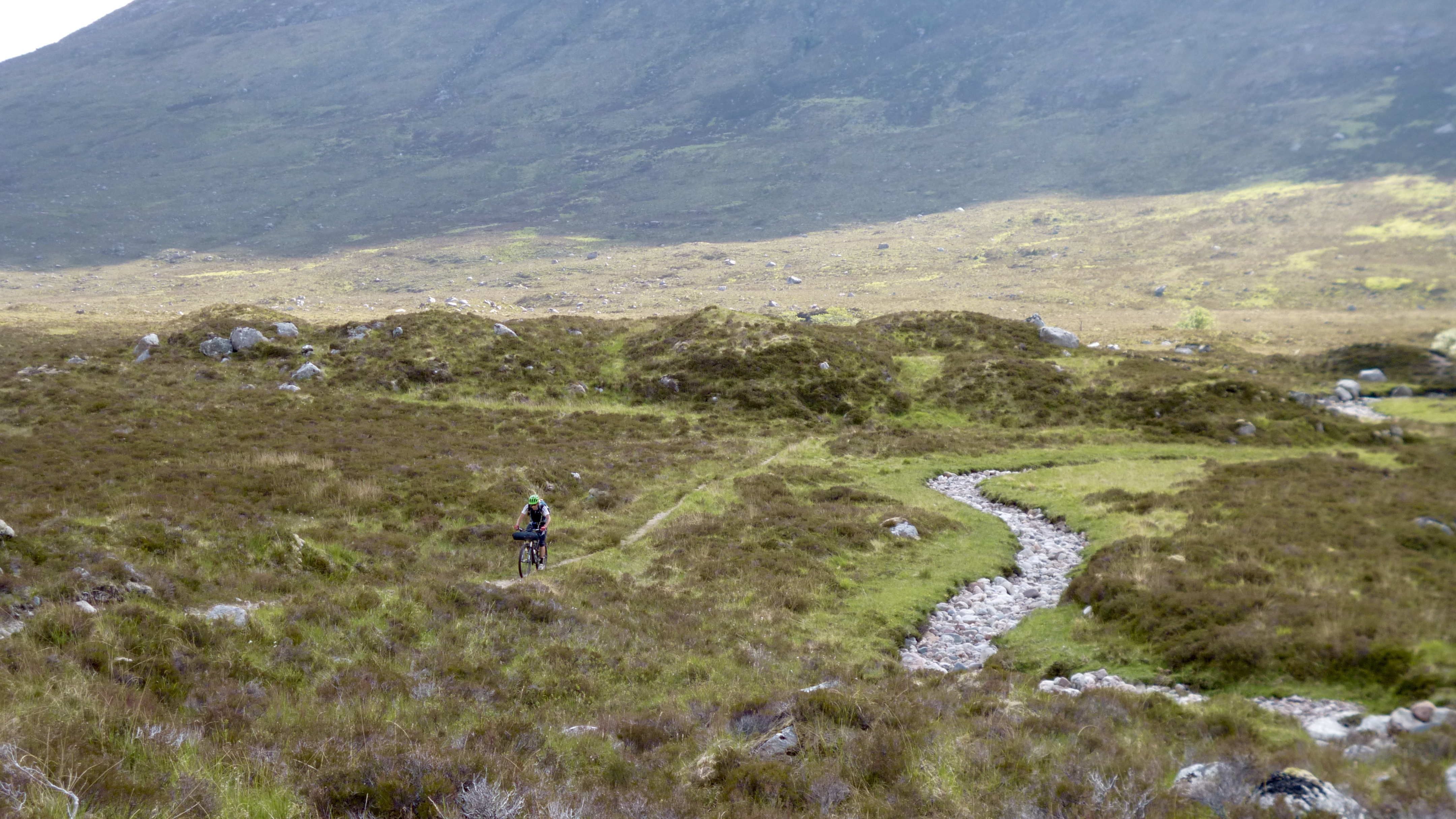 The Coffin Road was no exception; I left Andy behind while I picked my way across the undulating top of the hill. I’d just spent an hour pushing my bike to the top, yet it took another hour to fight across the “flat” and back down the other side. Alan was nowhere to be seen. After another 40 mins of climbing and I’d reached the “gate” to Fisherfield. Here, the old route broke off to the right, but this time we would dive down the stone track into the valley bottom and take the singletrack upstream, via Shenavall Bothy to Loch na Sealga.