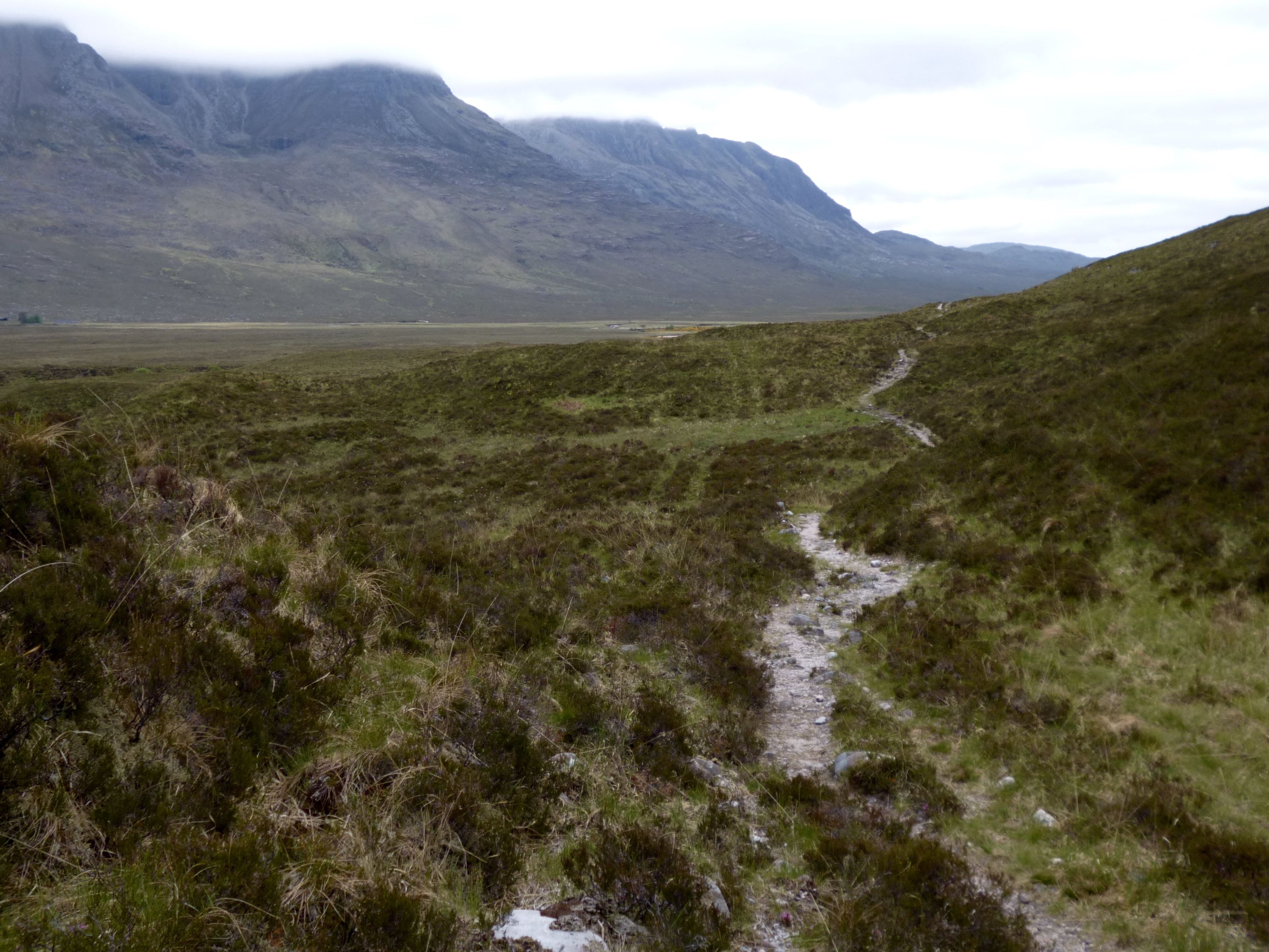 We span up the road taking a breakfast of sorts on the move. No resupply in Ullapool for us, but with what I had with me, I figured I’d be OK. At the end of Loch Broom, we picked up the Coffin Road – a steep and unforgiving push over to Dundonnel. Alan Goldsmith caught us up here, after his overnight stop in Ullapool. We chatted  briefly, and Andy said how hard it is to keep up with his planned daily schedule, and declaring that he planned to do 90 miles today.