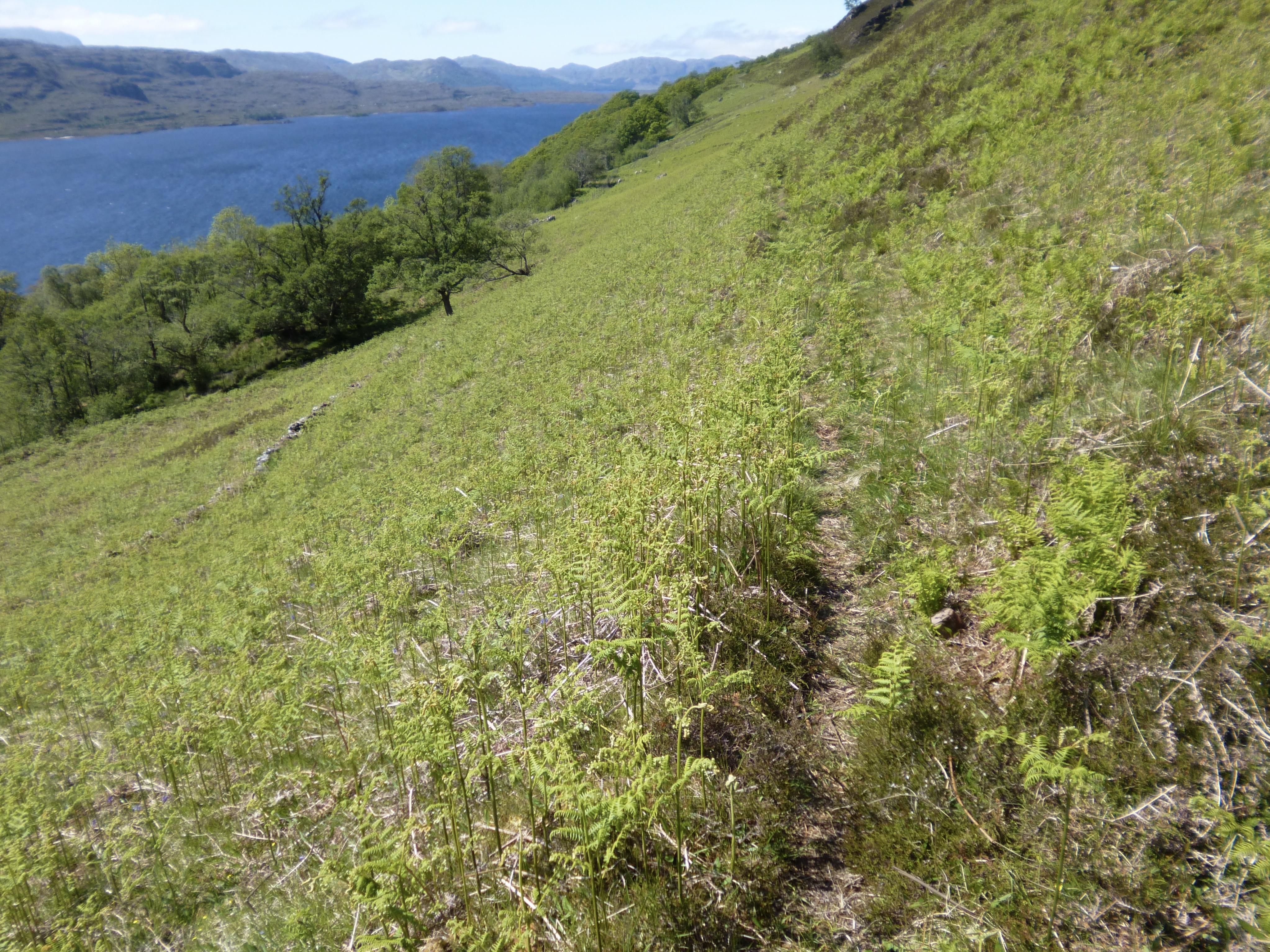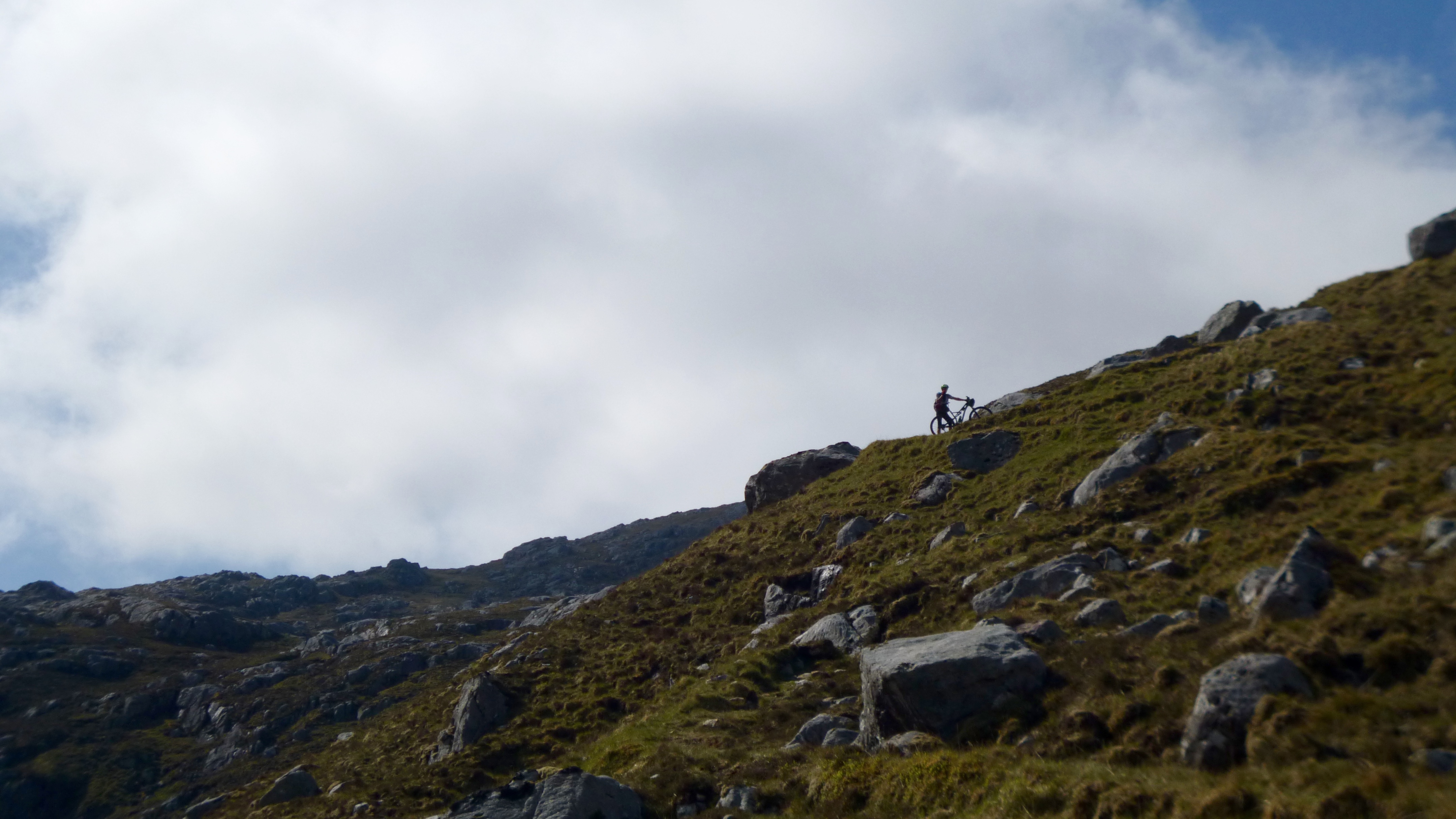 It was midday as I crossed the causeway and embarked on my exit to Fisherfield. This year would be via a new route called the Postman’s Path; a historic route where the postman would bring mail once a month from Letterewe to the lodge beyond the causeway. The opening section was really quite rideable, and it wasn’t long before I was over the top and embarking on the fast and twisting descent to Letterewe. The estate here is only accessible by boat now, since the water level in Loch Maree has changed, and consequently the route to Kinlochewe, at the end of Loch Maree, traces a line further up the hillside. From Letterewe, the trail was marked with a footpath sign. They weren’t kidding.
