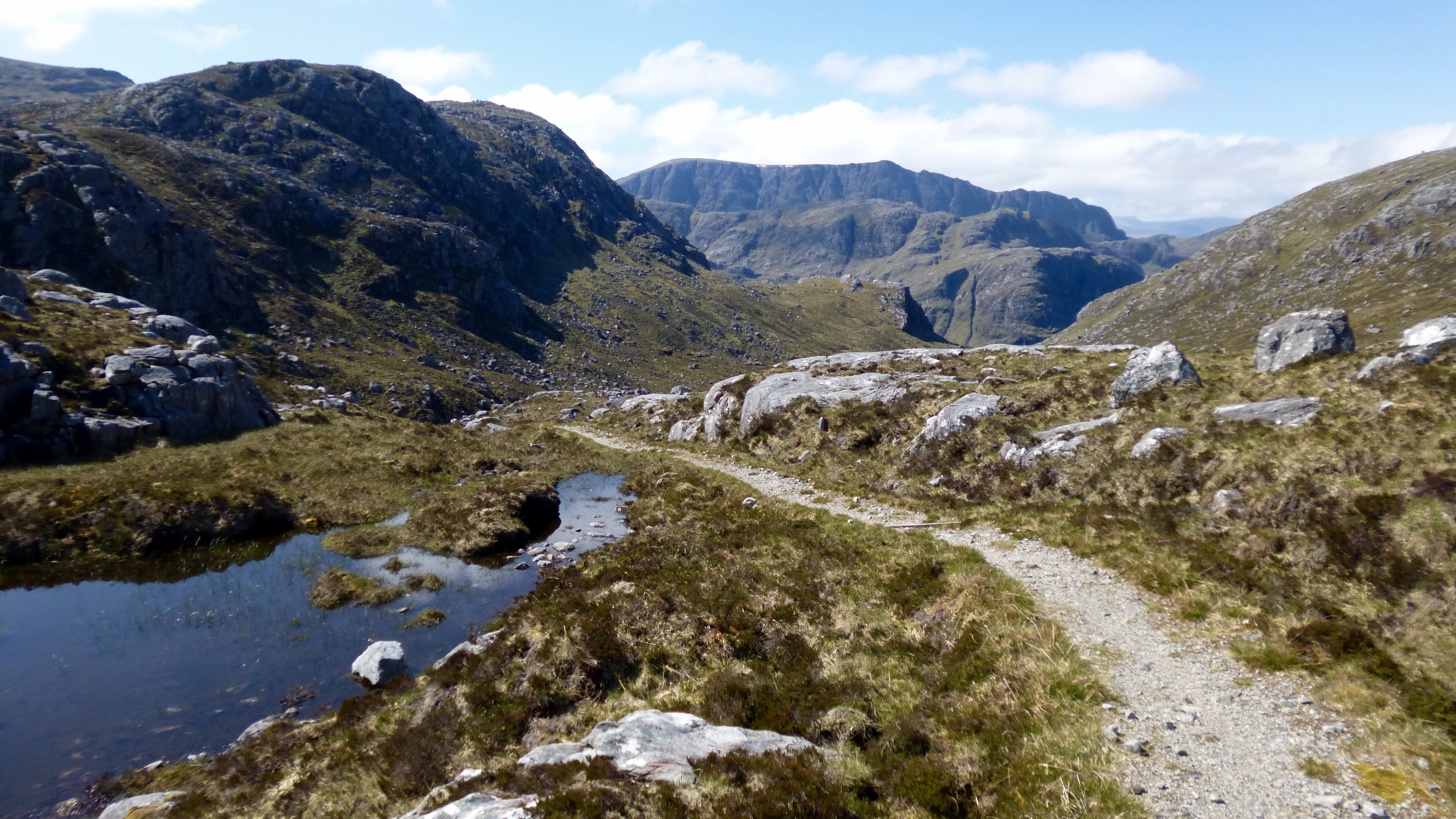 The scale of Fisherfield is deceiving. You can see all the summits around you, but there’s little sense of scale. The reality is that you’re a very small object in the bottom of the confluence of two very large valleys, and the head of the valley you can see as your exit is more than an hour away. With the sun out, things hot up and Alan eases past me while I adjust my layers, and peel off my arm warmers.