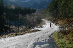 After an evening in the garage the fork was on and ready for its first ride on the Bothy trip. We rode out from Rhayader early evening on Saturday and took a winding route around the dams to Cwmystwyth before turing steeply up hill towards the forest and the Nant Rhys bothy. Despite the loaded bike and the singlespeed (32:20) the bike didn’t seem all that hard to pedal. Rolling resistance wasn’t that significant and while the extra weight in the front wheel was noticeable it didn’t detract from the ride.